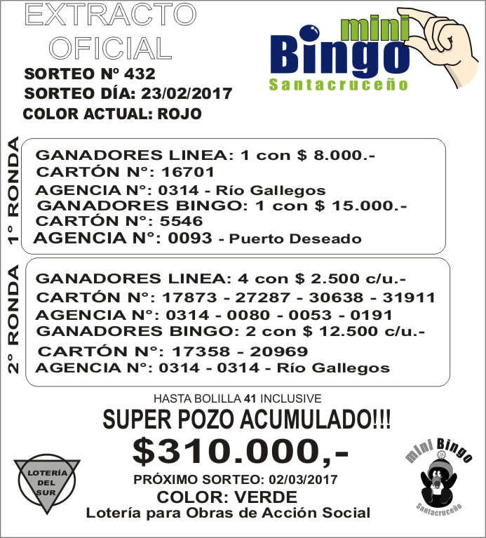 Este el resumen oficial de sorteo del MiniBingo Santacruceo correspondiente al sorteo N 432 de ayer jueves, en vivo por la pantalla de Canal 9. El superpozo acumulado a la bolilla 41, sigue vacante. MIRE EL EXTRACTO