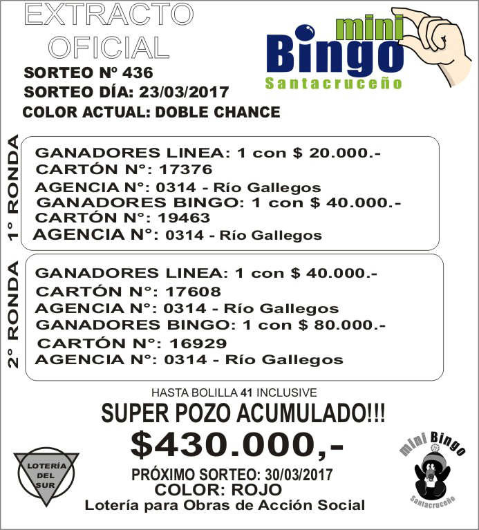 Este el resumen oficial de sorteo del MiniBingo Santacruceo correspondiente al sorteo N 436 "Doble Chance" de ayer jueves, en vivo por la pantalla de Canal 9. El superpozo acumulado de casi medio milln de pesos a la bolilla 41, sigue vacante. MIRE EL EXTRACTO