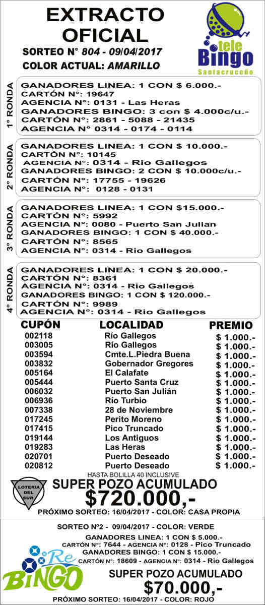 Se realizó el sorteo Nº 804 del producto de Lotería para Obras de Acción Social (LOAS). El superpozo acumulado de 720 mil a la bolilla 40 del Telebingo Santacruceño, sigue vacante. MIRE EL EXTRACTO GENERAL