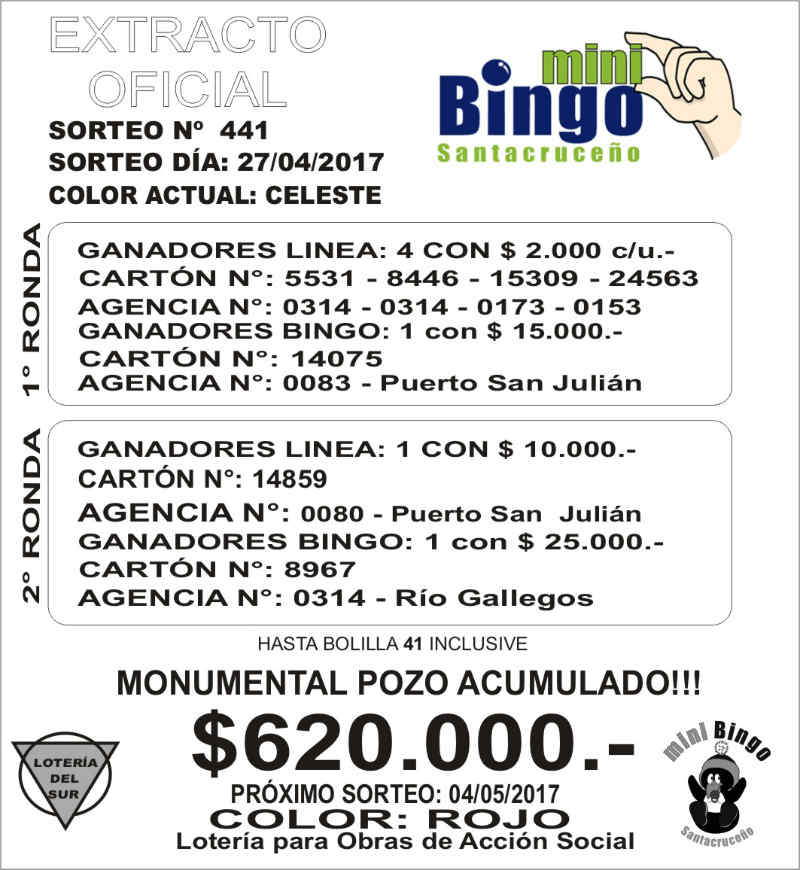 Este el resumen oficial de sorteo del MiniBingo Santacruceo correspondiente al sorteo N 441 de ayer jueves, en vivo por la pantalla de Canal 9. El superpozo acumulado de ms de medio milln de pesos a la bolilla 41, sigue vacante. MIRE EL EXTRACTO