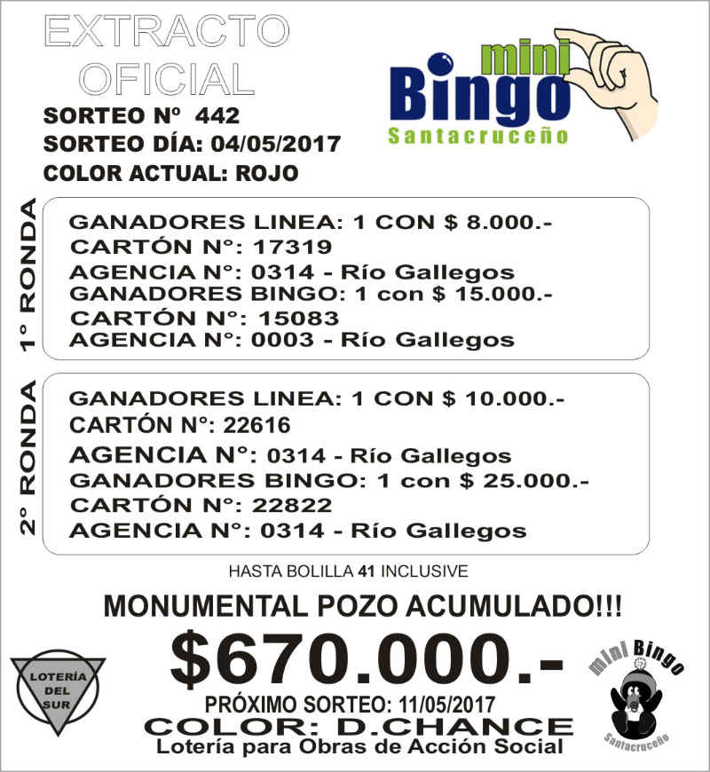 Este el resumen oficial de sorteo del MiniBingo Santacruceño correspondiente al sorteo Nº 442 de ayer jueves, en vivo por la pantalla de Canal 9. El superpozo acumulado de más de medio millón de pesos a la bolilla 41, sigue vacante. MIRE EL EXTRACTO