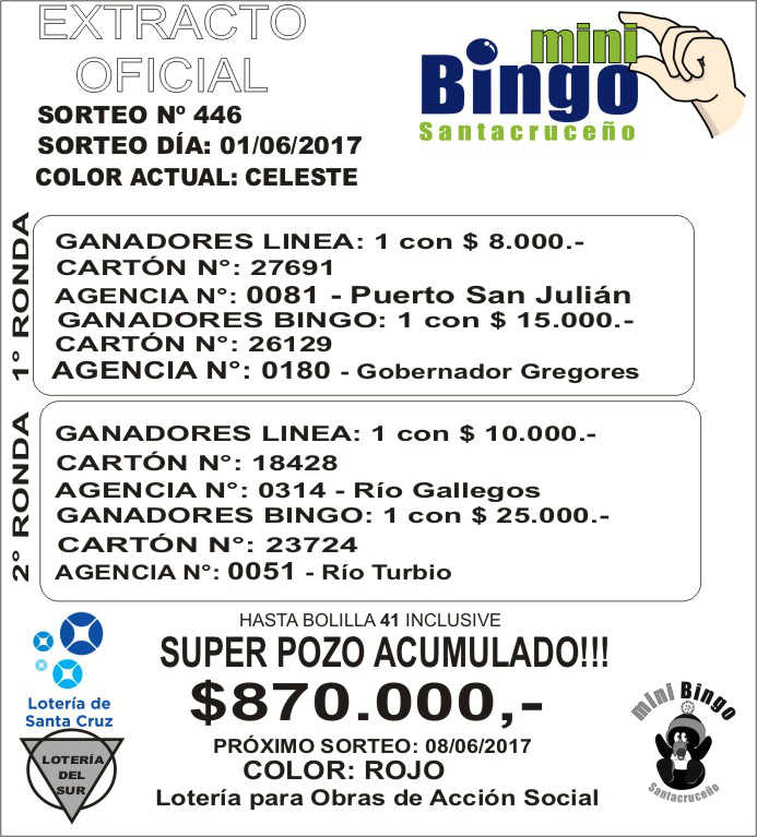 Este el resumen oficial de sorteo del MiniBingo Santacruceño correspondiente al sorteo Nº 446 de ayer jueves, en vivo por la pantalla de Canal 9. El superpozo acumulado de 870 mil pesos a la bolilla 41, sigue vacante. MIRE EL EXTRACTO