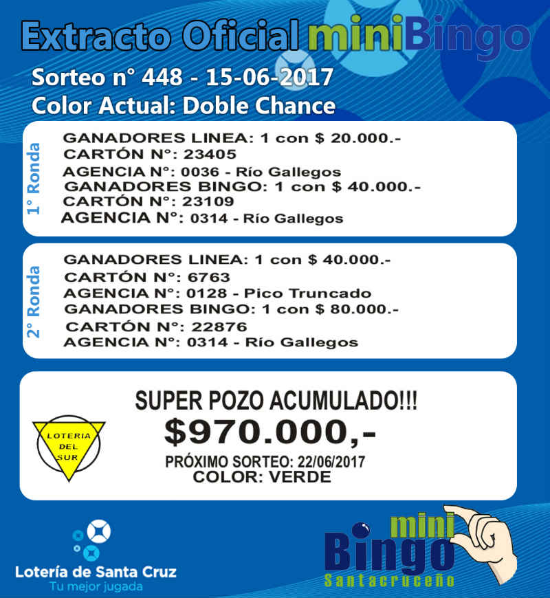 Este el resumen oficial de sorteo del MiniBingo Santacruceño correspondiente al sorteo Nº 448 (DOBLE CHANCE) de ayer jueves, en vivo por la pantalla de Canal 9. El superpozo acumulado de 970 mil pesos a la bolilla 41, sigue vacante. MIRE EL EXTRACTO