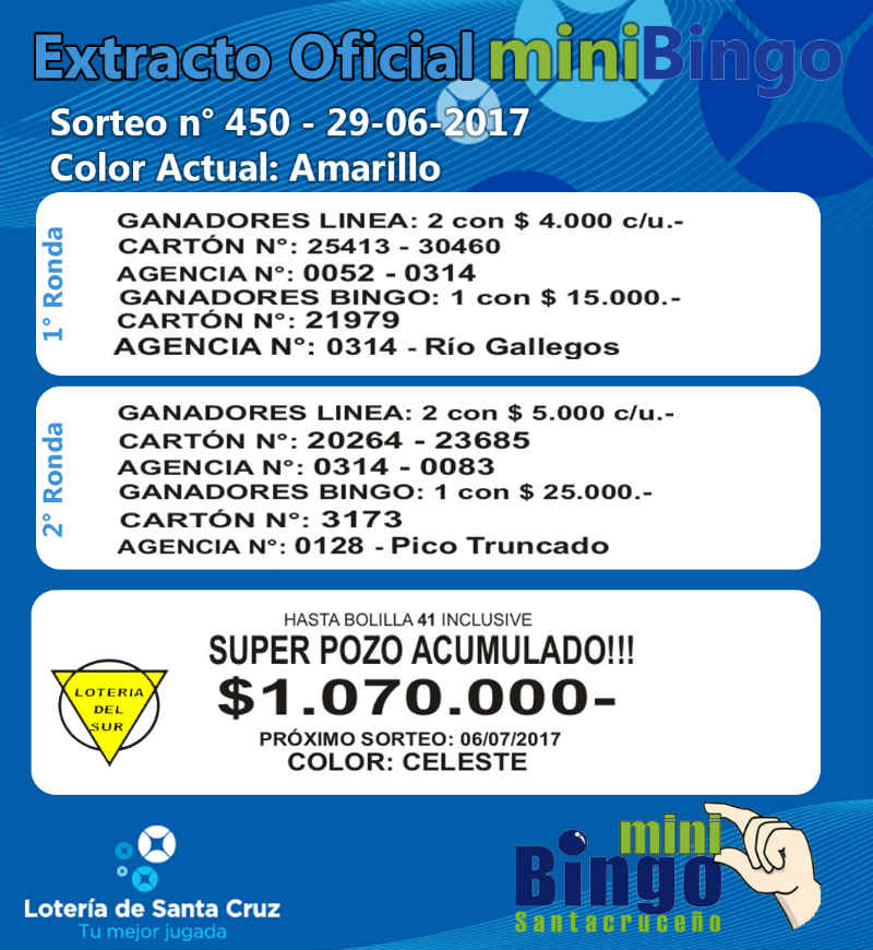 Este el resumen oficial de sorteo del MiniBingo Santacruceño correspondiente al sorteo Nº 450 de ayer jueves, en vivo por la pantalla de Canal 9. El superpozo acumulado de mas de un millón pesos a la bolilla 41, sigue vacante. MIRE EL EXTRACTO