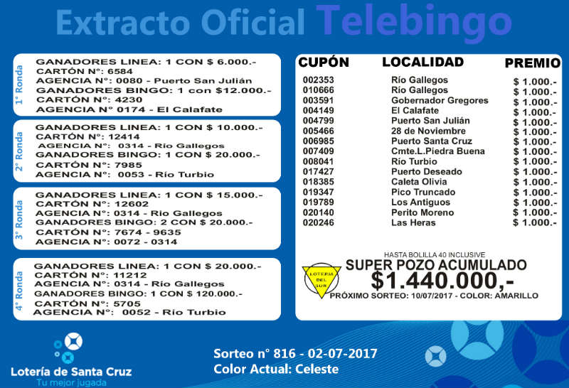 Se realiz un nuevo sorteo del producto de Lotera para Obras de Accin Social (LOAS) de la provincia de Santa Cruz, N 816. Sigue vacante el superpozo millonario a la bolilla 40 del Telebingo Santacruceo, record absoluto superando 1.4 millones. MIRE EL EXTRACTO GENERAL