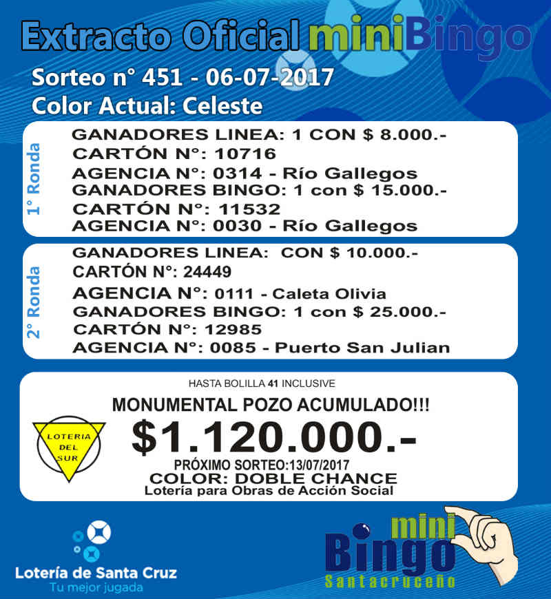 Este el resumen oficial de sorteo del MiniBingo Santacruceño correspondiente al sorteo Nº 451 de ayer jueves, en vivo por la pantalla de Canal 9. El superpozo acumulado de mas de un millón pesos a la bolilla 41, sigue vacante. MIRE EL EXTRACTO