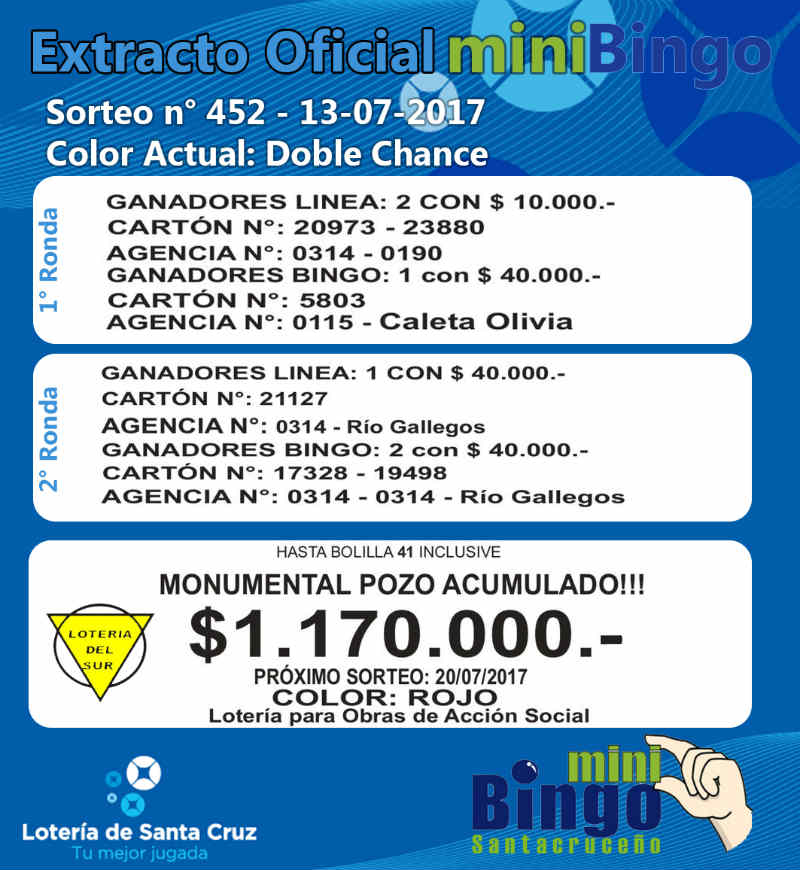Este el resumen oficial de sorteo del MiniBingo Santacruceño correspondiente al sorteo Nº 452 de ayer jueves, en vivo por la pantalla de Canal 9. El superpozo acumulado de mas de un millón pesos a la bolilla 41, sigue vacante. MIRE EL EXTRACTO