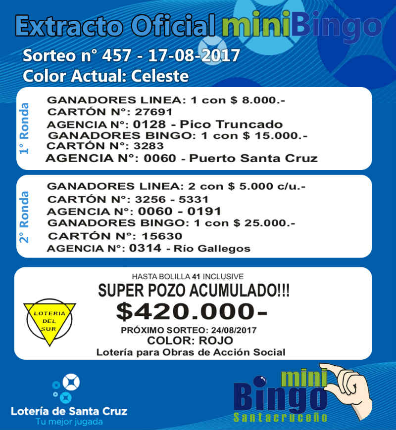 Este el resumen oficial de sorteo del MiniBingo Santacruceño correspondiente al Sorteo Nº 457 de ayer jueves, en vivo por la pantalla de Canal 9. El superpozo acumulado a la bolilla 41 siguen vacante con mas de 400 mil pesos. MIRE EL EXTRACTO
