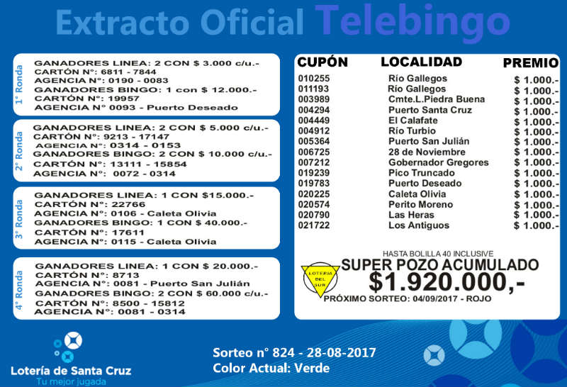 Se realizó un nuevo sorteo del producto de Lotería para Obras de Acción Social (LOAS) de la provincia de Santa Cruz, Nº 824. Sigue vacante el superpozo millonario a la bolilla 40 del Telebingo Santacruceño, con 1.92 millones. MIRE EL EXTRACTO GENERAL