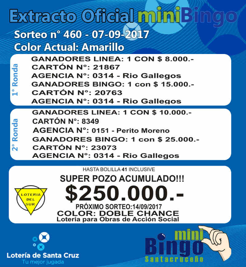 Este el resumen oficial de sorteo del MiniBingo Santacruceño correspondiente al Sorteo Nº 460 de ayer jueves, en vivo por la pantalla de Canal 9. El superpozo acumulado a la bolilla 41 sigue vacante. MIRE EL EXTRACTO