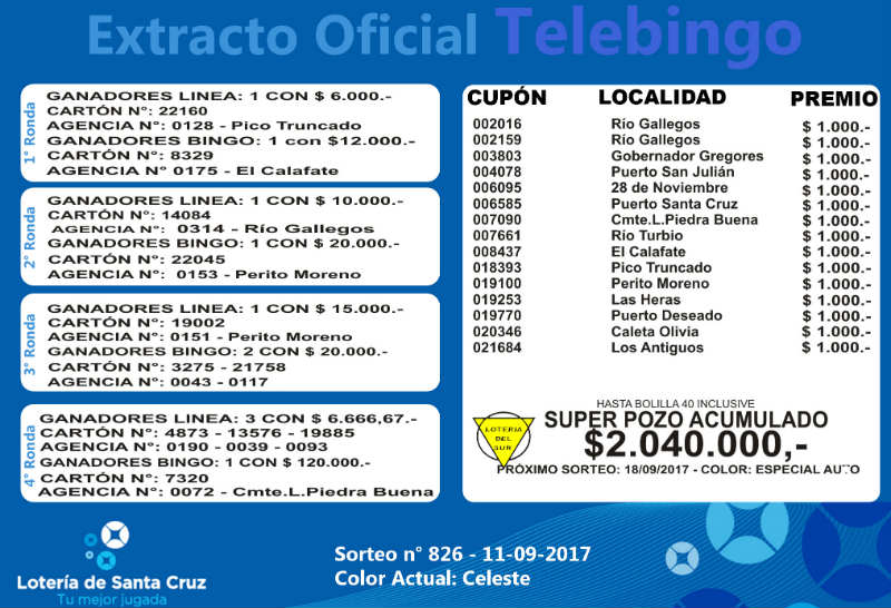 Se realizó un nuevo sorteo del producto de Lotería para Obras de Acción Social (LOAS) de la provincia de Santa Cruz, Nº 826. Sigue vacante el superpozo millonario a la bolilla 40 del Telebingo Santacruceño, con más de 2 millones. MIRE EL EXTRACTO GENERAL