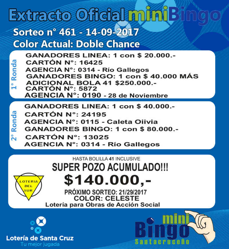 Este el resumen oficial de sorteo del MiniBingo Santacruceño correspondiente al Sorteo Nº 461 (ESPECIAL) de ayer jueves, en vivo por la pantalla de Canal 9. Un ganador se llevó el superpozo acumulado a la bolilla 41 de 250 mil pesos. MIRE EL EXTRACTO