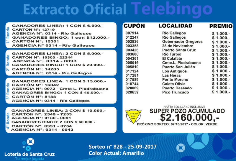 Se realizó un nuevo sorteo del producto de Lotería para Obras de Acción Social (LOAS) de la provincia de Santa Cruz, Nº 828. Sigue vacante el superpozo millonario a la bolilla 40 del Telebingo Santacruceño, con más de 2 millones. MIRE EL EXTRACTO GENERAL