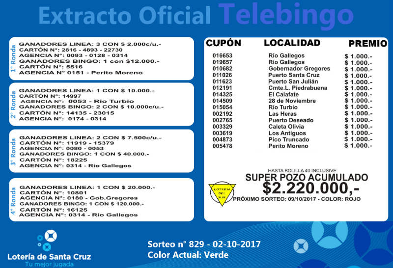 Se realizó un nuevo sorteo del producto de Lotería para Obras de Acción Social (LOAS) de la provincia de Santa Cruz, Nº 829. Sigue vacante el superpozo millonario a la bolilla 40 del Telebingo Santacruceño, con más de 2.2 millones. MIRE EL EXTRACTO GENERAL