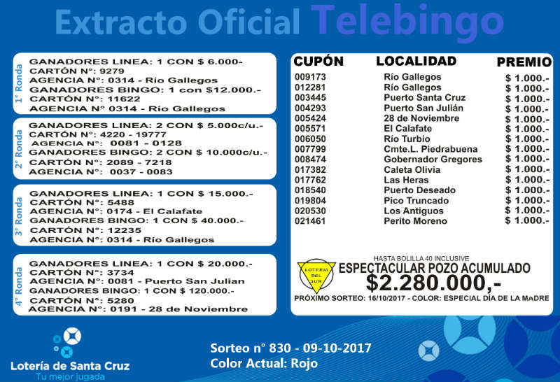 Se realizó un nuevo sorteo del producto de Lotería para Obras de Acción Social (LOAS) de la provincia de Santa Cruz, Nº 830. Sigue vacante el superpozo millonario a la bolilla 40 del Telebingo Santacruceño, con más de 2.2 millones. MIRE EL EXTRACTO GENERAL
