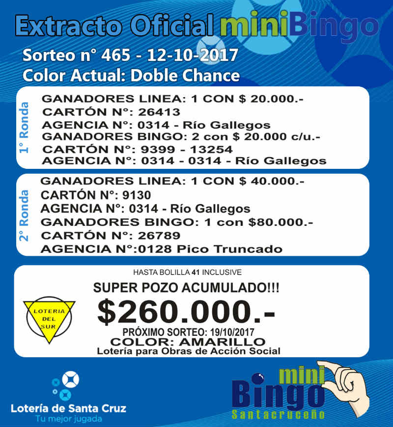 Este el resumen oficial de sorteo del MiniBingo Santacruceño correspondiente al Sorteo Nº 465 (Doble Chance) de ayer jueves, en vivo por la pantalla de Canal 9. El superpozo acumulado a la bolilla 41 sigue vacante. MIRE EL EXTRACTO