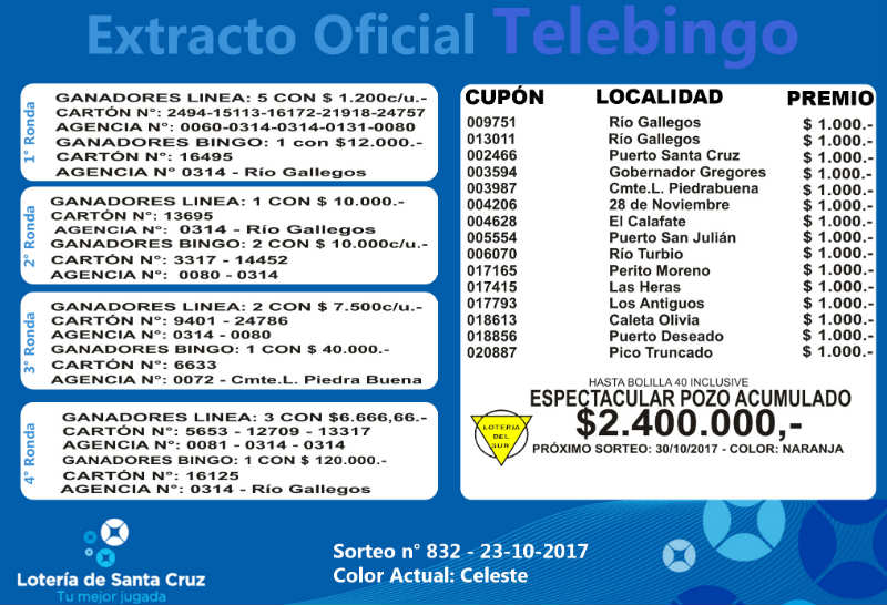 Se realizó un nuevo sorteo del producto de Lotería para Obras de Acción Social (LOAS) de la provincia de Santa Cruz, Nº 832. Sigue vacante el superpozo millonario a la bolilla 40 del Telebingo Santacruceño, con más de 2.4 millones. MIRE EL EXTRACTO GENERAL