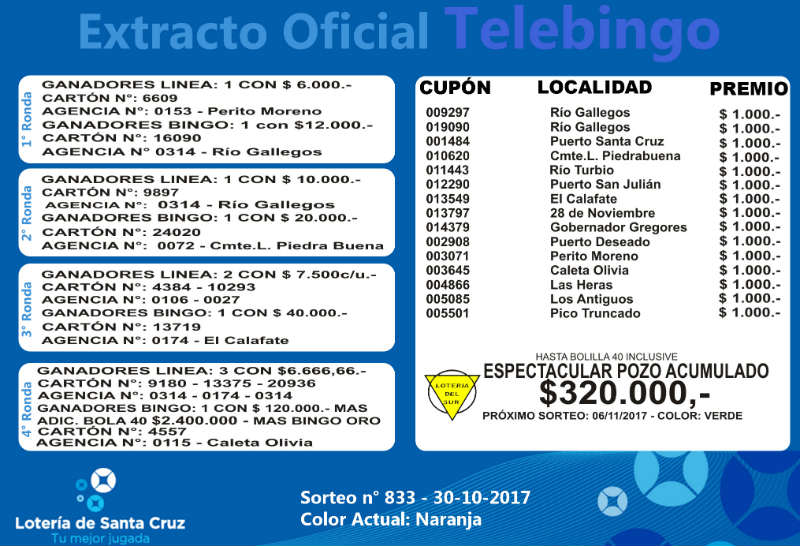 Se realizó un nuevo sorteo del producto de Lotería para Obras de Acción Social (LOAS) de la provincia de Santa Cruz, Nº 833. Un solo ganador, de la ciudad del Gorosito ganó la cuarta partida y cantó bingo antes de la bolilla 40, por ende ganó 120 mil de premio, el superpozo de 2,4 millones y el Bingo Oro de una Camioneta Renault "Oroch" 0 km. MIRE EL EXTRACTO GENERAL