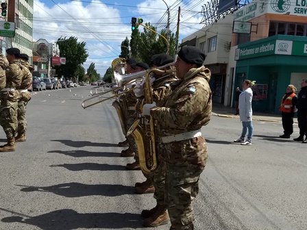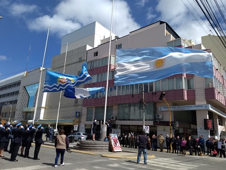 El fuerte viento imperante no impidi que en la cntrica esquina de la capital de Santa Cruz, se realizara el tradicional izamiento, con la presencia del intendente de Ro Gallegos, Roberto Giubetich, algunos integrantes del ejecutivo, la Banda Militar del regimiento de esta ciudad, as como integrantes de la Escuela de Polica.