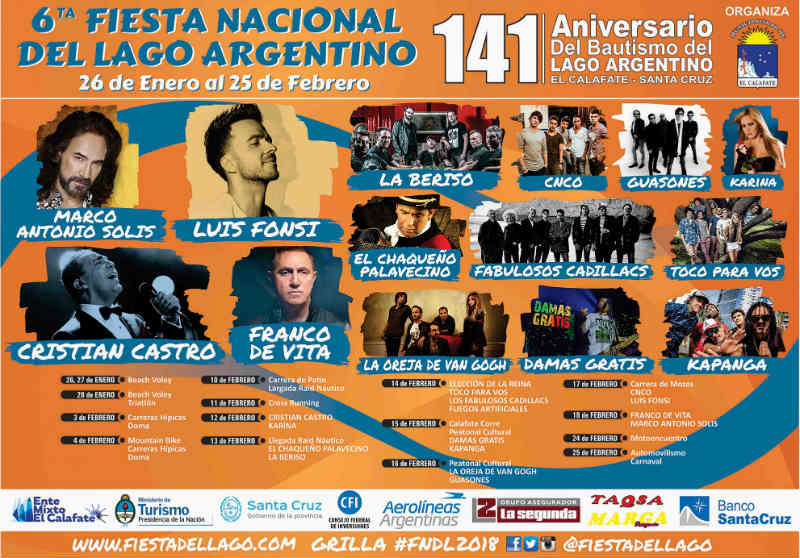 El acto estuvo presidido por el Intendente de El Calafate, Javier Belloni, el Secretario Coordinador, Martn Freile quien dio a conocer en detalle todas las actividades. La 6ta. Fiesta Nacional del Lago,ser del 12 al 18 de febrero de 2018 y como ha ocurrido en ediciones anteriores, solo se cobrar las dos ltimas noches, donde actuarn CNCO, Luis Fonsi, Franco de Vita y Marco Antonio Solis. El Torneo de Beach Vley dar inicio con las actividades del 141 Aniversario del Bautismo del Lago Argentino, los das 26, 27 y 28 de enero, cerrando con el carnaval el 25 de febrero. La venta de entrada para los no residentes comenzar el 3 de enero de 2018, mientras que para los residentes ser a partir del 15 de febrero.