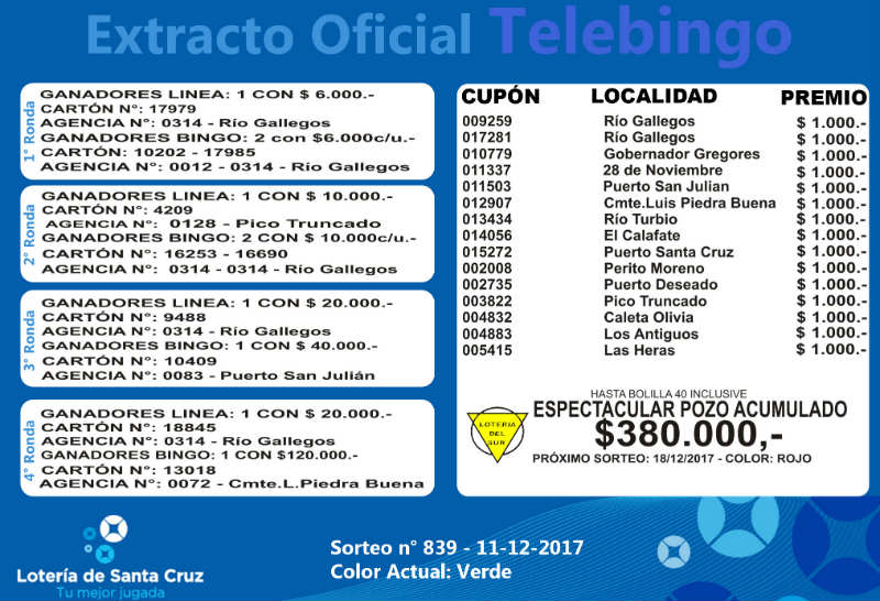 Se realizó un nuevo sorteo del producto de Lotería para Obras de Acción Social (LOAS) de la provincia de Santa Cruz, Nº 839. Sigue vacante el superpozo a la bolilla 40 del Telebingo Santacruceño. MIRE EL EXTRACTO GENERAL