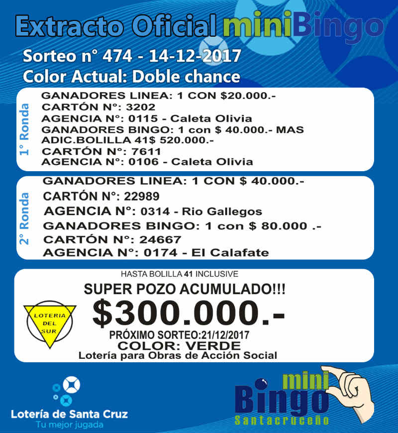 Este el resumen oficial del MiniBingo Santacruceño correspondiente al Sorteo Nº 474 de ayer jueves, en vivo por la pantalla de Canal 9. El superpozo acumulado a la bolilla 41 con medio millón de pesos salió en Caleta Olivia. MIRE EL EXTRACTO