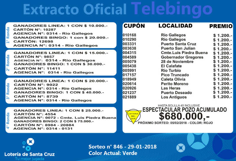 Se realizó un nuevo sorteo del producto de Lotería para Obras de Acción Social (LOAS) de la provincia de Santa Cruz, Nº 846. Sigue vacante el superpozo a la bolilla 40 del Telebingo Santacruceño que ahora suma 680 mil pesos. MIRE EL EXTRACTO GENERAL