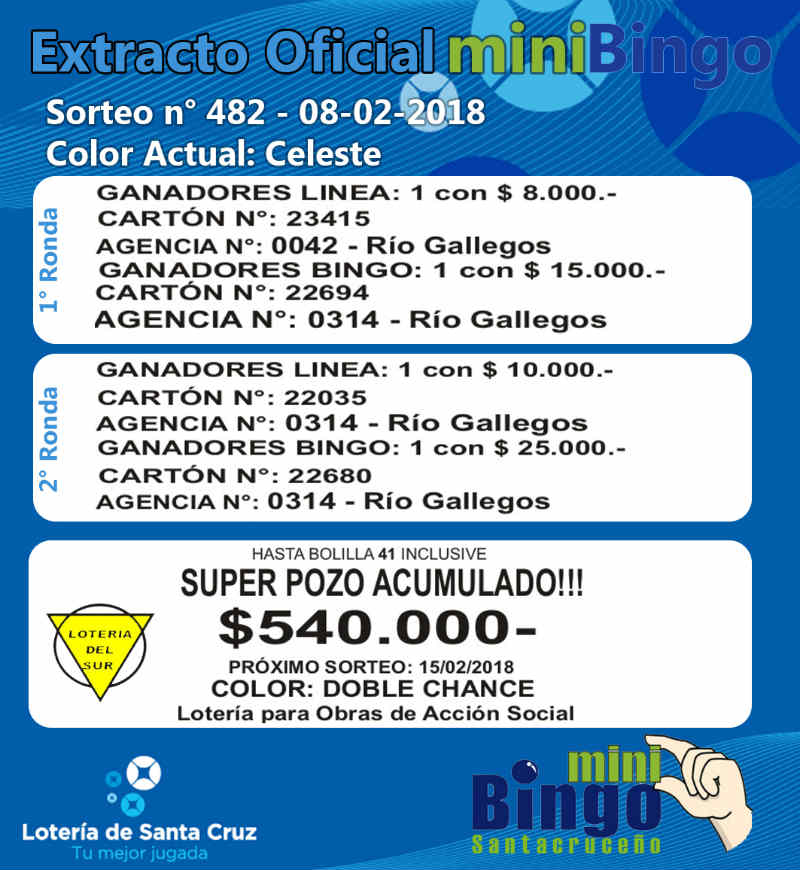 Este el resumen oficial del MiniBingo Santacruceño correspondiente al Sorteo Nº 482 de ayer jueves, en vivo por la pantalla de Canal 9. El superpozo acumulado a la bolilla 41 sigue vacante. MIRE EL EXTRACTO