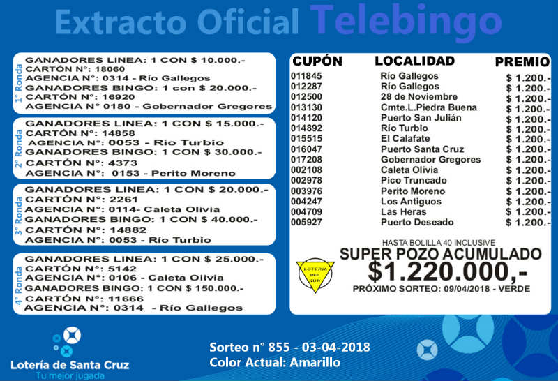Se realizó un nuevo sorteo del producto de Lotería para Obras de Acción Social (LOAS) de la provincia de Santa Cruz, Nº 855. Sigue vacante el superpozo a la bolilla 40 del Telebingo que ahora supera el "Millón" de pesos. MIRE EL EXTRACTO GENERAL