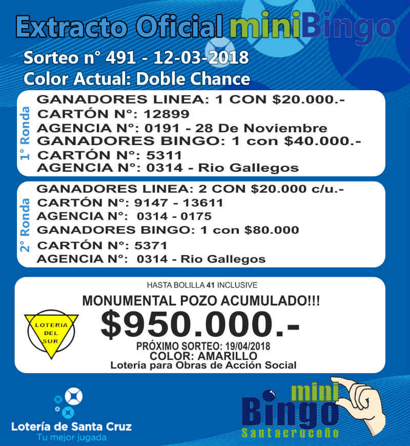 Este el resumen oficial del MiniBingo Santacruce駉 correspondiente al Sorteo N 491 de ayer jueves, en vivo por la pantalla de Canal 9. El superpozo acumulado a la bolilla 41 sigue vacante. MIRE EL EXTRACTO