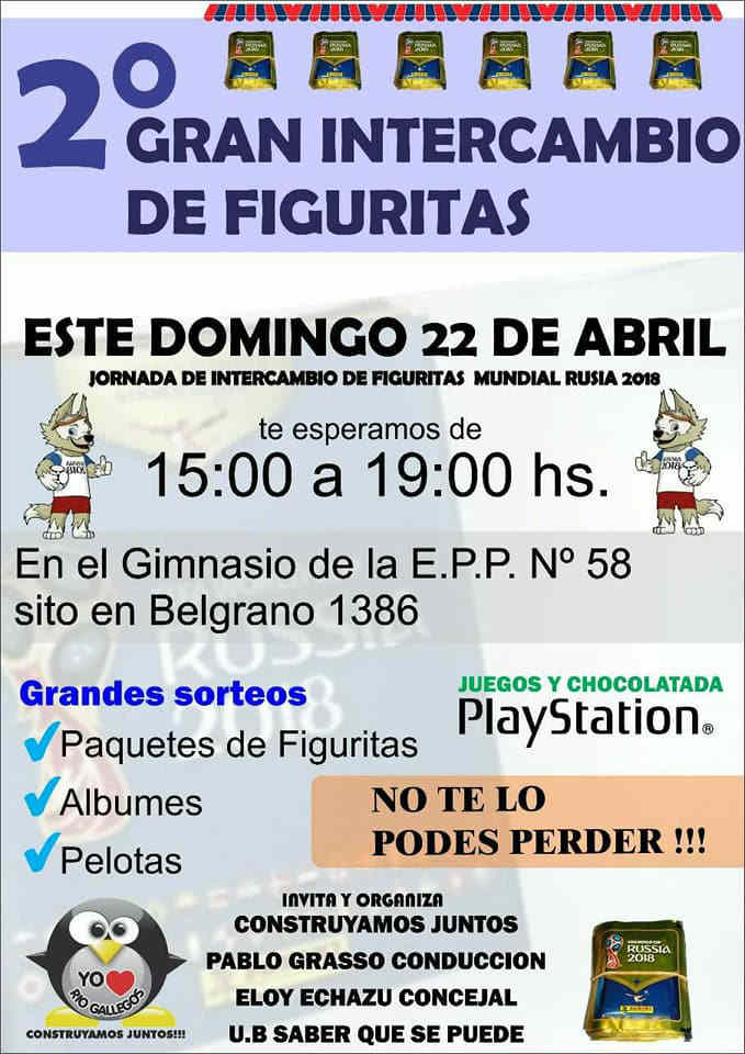 Este próximo domingo 22 de abril, en las instalaciones de la EPP Nº 58, en Belgrano 1386 de 15:00 a 19:00, se realizará la Segunda jornada de intercambio de figuritas, en la que grandes y chicos, principalmente los más peques, podrán intercambiar figuritas para llenar el Album del Mundial de Fútbol Rusia 2018.