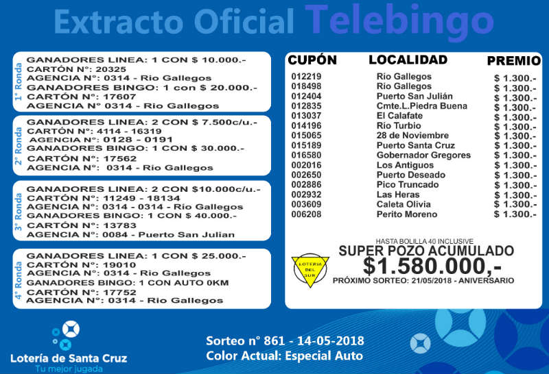 Se realiz un nuevo sorteo del producto de Loter韆 para Obras de Acci髇 Social (LOAS) de la provincia de Santa Cruz, N 861. Sigue vacante el superpozo millonario a la bolilla 40. MIRE EL EXTRACTO GENERAL