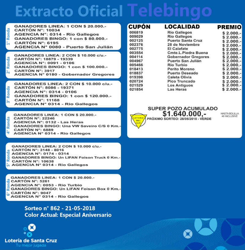 Se realiz un nuevo sorteo del producto de Loter韆 para Obras de Acci髇 Social (LOAS) de la provincia de Santa Cruz, N 862. Sigue vacante el superpozo millonario a la bolilla 40. MIRE EL EXTRACTO GENERAL