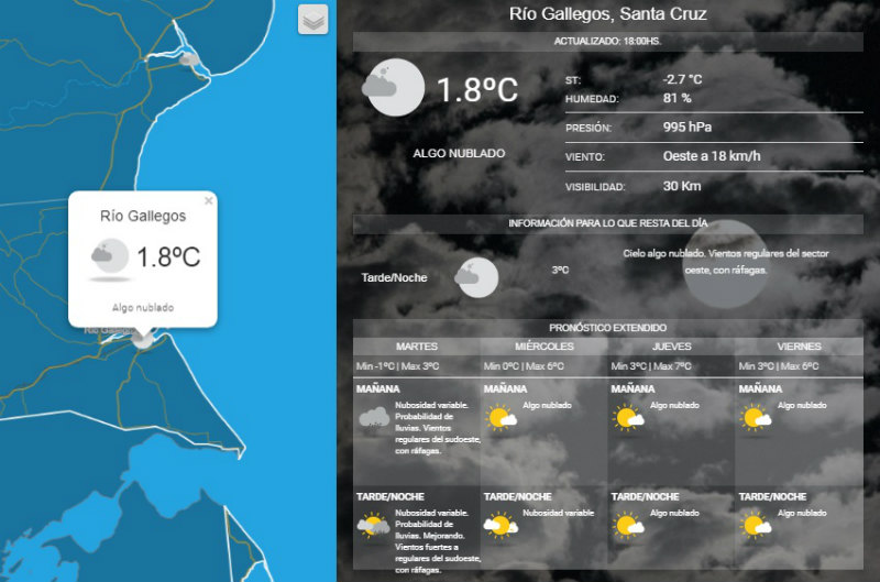 Según anunció el ente nacional del clima, la temperatura en la capital santacruceña rondará los 5º de máxima con sensación térmica "Bajo 0". También informaron posibles lluvias para mañana martes. MIRE EL PRONOSTICO EXTENDIDO