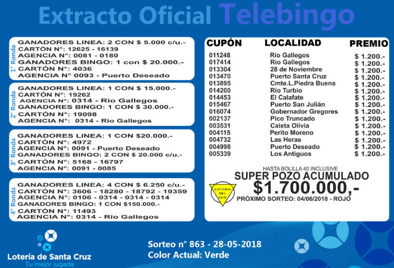 Se realizó un nuevo sorteo del producto de Lotería para Obras de Acción Social (LOAS) de la provincia de Santa Cruz, Nº 863. Sigue vacante el superpozo millonario a la bolilla 40. MIRE EL EXTRACTO GENERAL