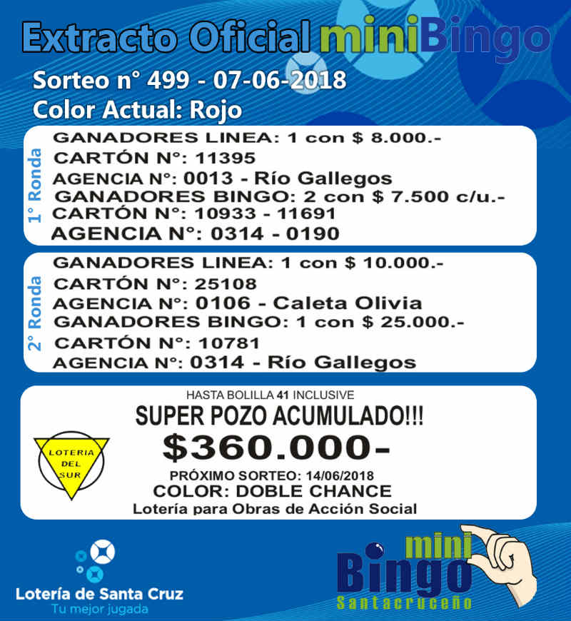 Este el resumen oficial del MiniBingo Santacruceño correspondiente al Sorteo Nº 499 de ayer jueves, en vivo por la pantalla de Canal 9.