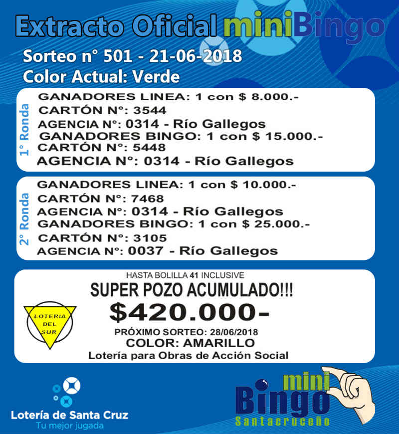 Este el resumen oficial del MiniBingo Santacruceño correspondiente al Sorteo Nº 501 de ayer jueves, en vivo por la pantalla de Canal 9. El superpozo acumulado a la bolilla 41 sigue vacante. MIRE EL EXTRACTO