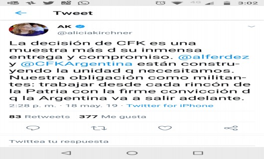 El anuncio de Cristina Fernández sobre su candidatura a vicepresidenta de Alfredo Fernández pateó el tablero político. La sorpresiva decisión de la ex Jefa de Estado tomó por sorpresa a todos y volvió a acomodar las piezas. Tras esto, la gobernadora Alicia Kirchner escribió a través de las redes sociales: "La decisión de Cristina es una muestra más de su inmensa entrega y compromiso por nuestro país".
