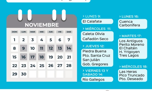 - 17/11 Los Antiguos, Perito Moreno, El Chaltén, Hipólito Yrigoyen, Tres Lagos.