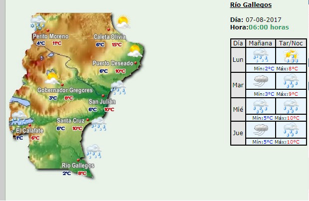 Rio Gallegos | As lo informa el Servicio Meteorolgico Nacional. La capital de Santa Cruz, como as tambin varias localidades del interior provincial, desde el pasado sbado estn azotadas por las inclemencias climticas, y seguir al menos hasta el jueves. MIRE EL PRONOSTICO EXTENDIDO