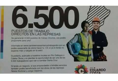 Rio Gallegos | En medio de la campaa, el espacio poltico de Mauricio Macri y que representa Eduardo Costa en Santa Cruz promete 6500 puestos de trabajo en las represas. La condicin: acercarse a los puestos de Ro Gallegos o Caleta Olivia. Similitudes con la expo empleo en Buenos Aires.