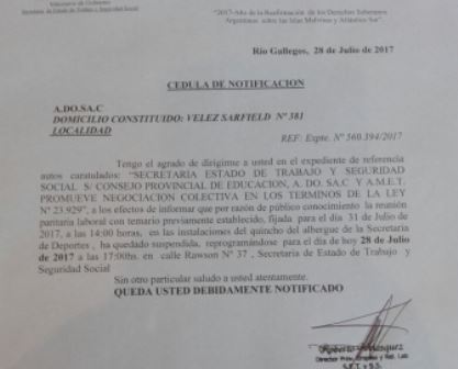 Rio Gallegos | En el da de hoy el gremio docente recibi una cdula de notificacin paritaria en donde se indic que se reprogram la reunin establecida para el lunes 31/7 a este viernes 28/7 a las 17 hs en la Secretara de Trabajo en Rawson 37.