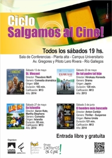 Rio Gallegos | El sbado 13 de mayo a las 19 hs. comienza la octava edicin del ciclo Salgamos al cine en el Campus Universitario. Con la pelcula St.Vincent de Theodore Melfi se relanza el ciclo que desde el ao 2009 organiza el grupo Salgamos al Cine y la Unidad Acadmica Ro Gallegos de la UNPA.