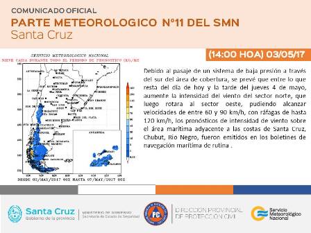 Rio Gallegos | La Direccin Provincial de Proteccin Civil comunica el parte Meteorolgico que establece que debido al pasaje de un sistema de baja presin a travs del sur del rea de cobertura, se prev que entre lo que resta del da de hoy y la tarde del jueves 4 de mayo, aumente la intensidad del viento.