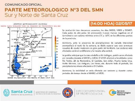 Rio Gallegos | Se podra anticipar que la zona aledaa a Ro Gallegos, podra verse afectada por nevadas durante el MIE03 y JUE04. El VIE05 afectar a localidades como Ro Turbio, 28 de Noviembre, El Calafate, San Julin, Santa Cruz, Perito Moreno, Los Antiguos, Las Heras, etc. durante todo el periodo, las precipitaciones nveas afectarn a El Chaltn.