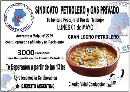 Rio Gallegos | El Secretario General del Sindicato de Petrleo y Gas Privado de Santa Cruz, Claudio Vidal, invita a los afiliados a retirar el Lunes 1 de Mayo el locro Petrolero Da del Trabajador, totalmente gratuito, tal como se realiz el ao pasado.