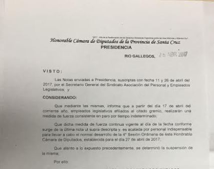 Rio Gallegos | Mediante la resolucin N 100/17 firmada por el Vicegobernador Pablo Gonzlez y el secretario General de la Cmara de Diputados Pablo Noguera se suspendi el desarrollo de la 4 Sesin Ordinaria establecida para maana 27 de Abril.