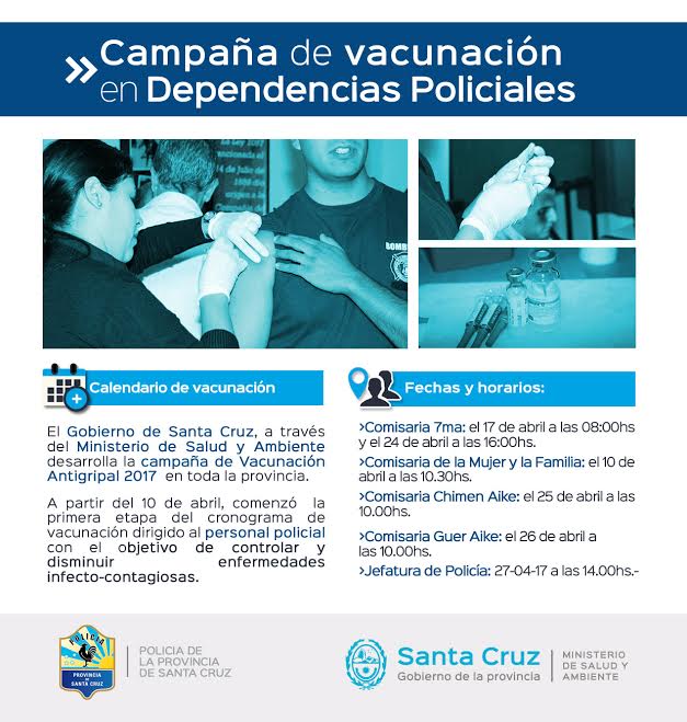Rio Gallegos | El pasado 10 de abril, a travs del Ministerio de Salud de la Provincia de Santa Cruz y la Secretaria de Estado de Seguridad, dependiente del Ministerio de Gobierno, dio inicio a la Campaa de Vacunacin Antigripal dirigido a todo el personal de la Polica de la Provincia de Santa Cruz.