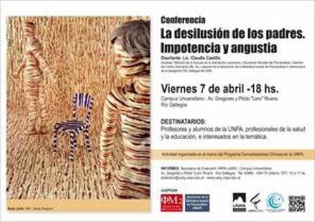 Rio Gallegos | Claudia CastilloLa Lic. Claudia Castillo, visita nuevamente la Unidad Acadmica Ro Gallegos de la UNPA para brindar una conferencia abierta titulada "La desilusin de los padres. Impotencia y angustia. La disertacin se llevar a cabo el viernes 7 de abril de 18 a 20 horas en la sala de conferencias Prof. Iris Bergero del Campus Universitario.