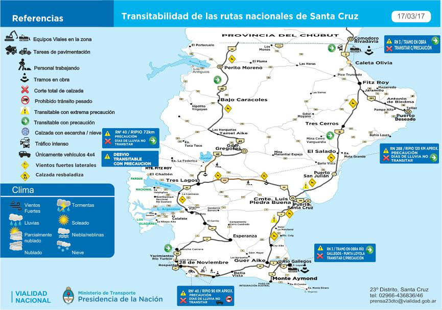Rio Gallegos | La Direccin Nacional de Vialidad inform que el tramo Tres Lagos - empalme RP73, de la ruta nacional N40 se rehabilit para todo tipo vehculos, luego de cinco das de corte total, debido al desborde de una alcantarilla.